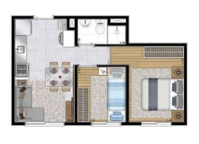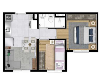 Aptos tipo 2 dorms. s/ suíte s/ terraço: 32,20m² a 33,21m²